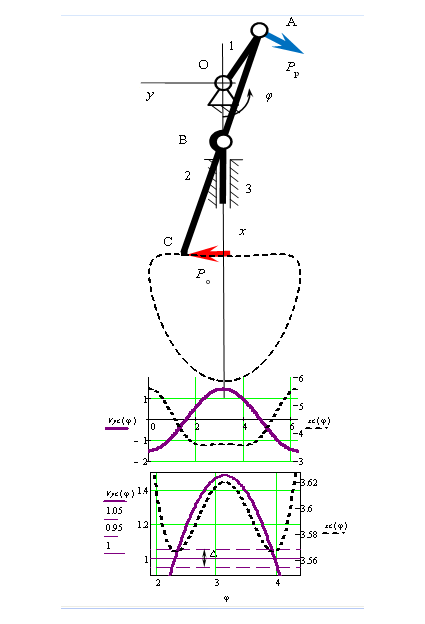 Fig. 2. Kinematic scheme and graphs of change of kinematic parameters of guide bearing central slide-crank mechanism