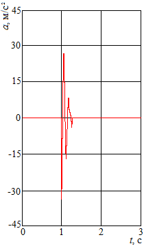 Результати розрахунку показали, що прискорення, які діють на несучу конструкцію першої з боку сили секції вагона-платформи, складають 38,2 м/с², а другої – близько 37,5 м/с² (рис. 3).