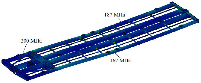 Розрахунок на міцність вагона-платформи для перевезення контейнерів наведено в [19]. Ураховано, що на вагоні-платформі знаходяться два 40-футових контейнери. Чисельні значення розрахункових навантажень, які діють на вагон-платформу, узято відповідно до чинних нормативів.