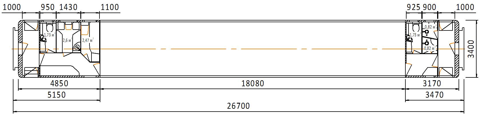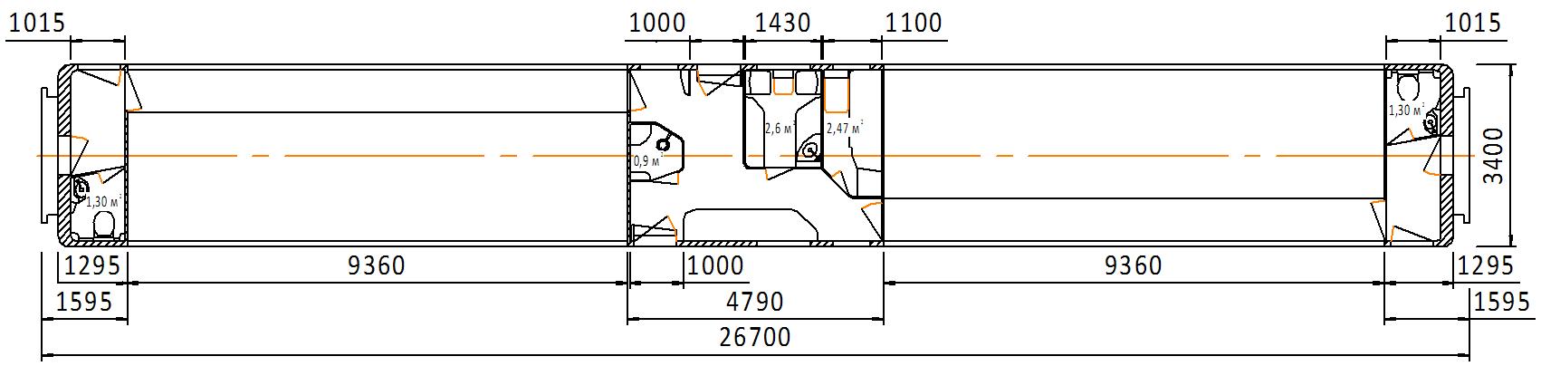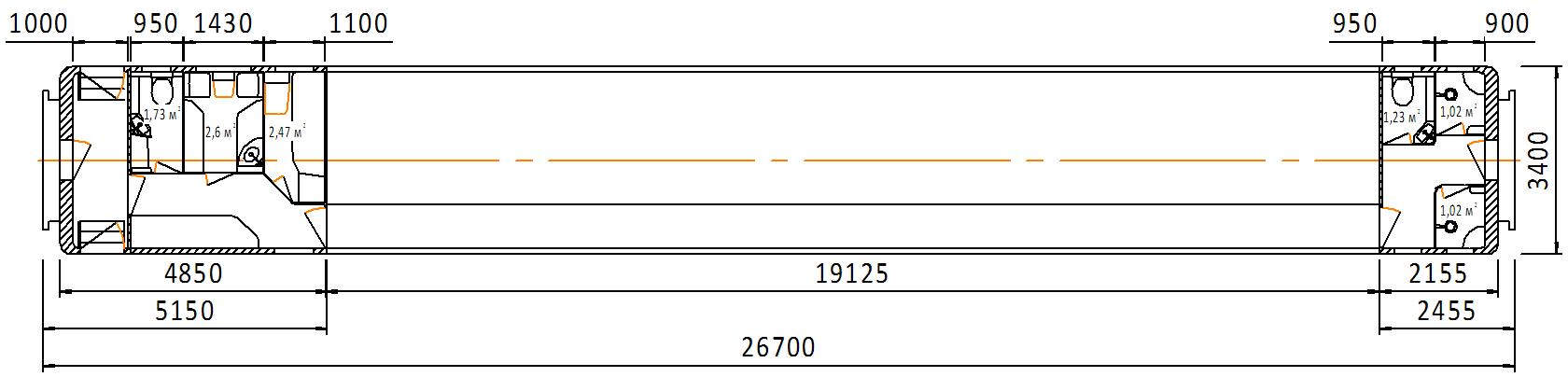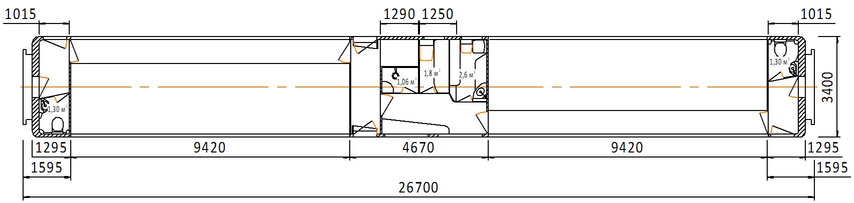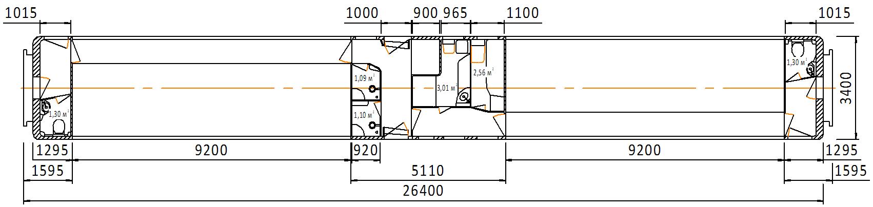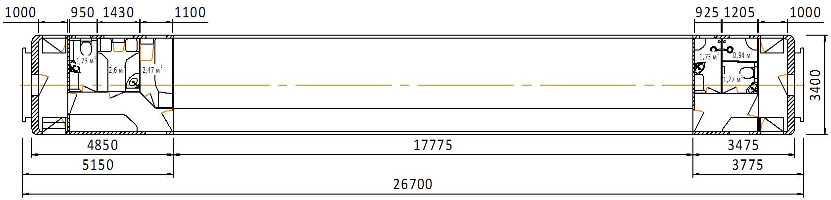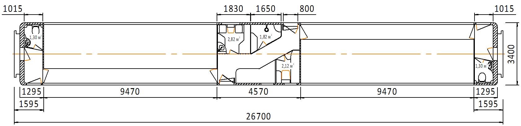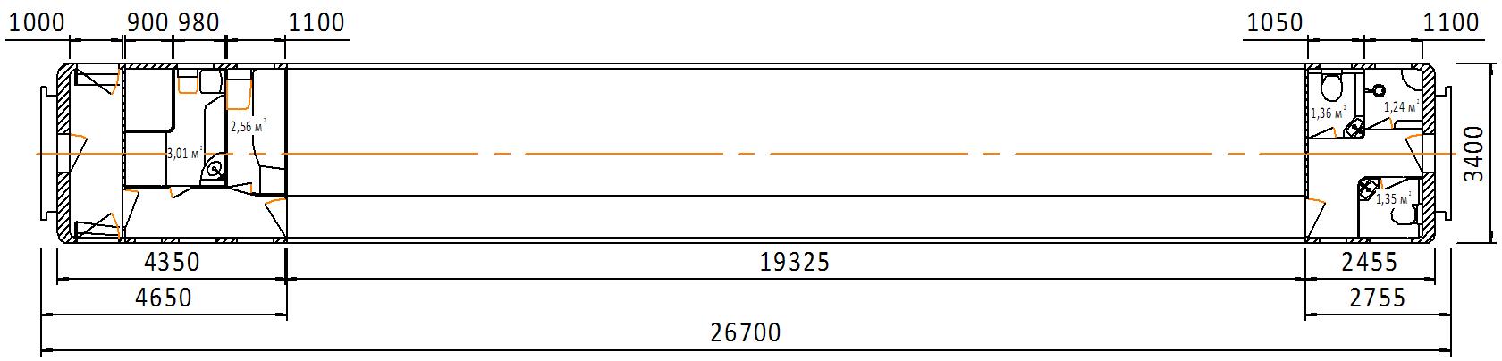 – із двома тамбурами й двома туалетними приміщеннями, розміщеними біля робочого й неробочого тамбурів, тобто у двох кінцях кузова вагона (рис. 1, а);
