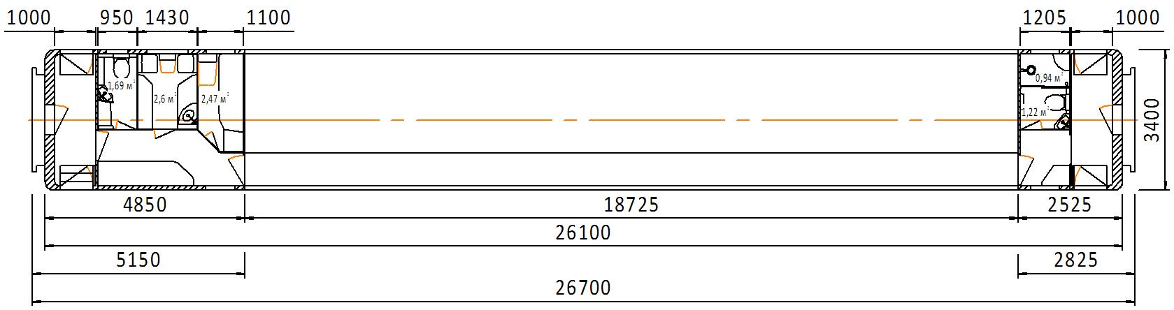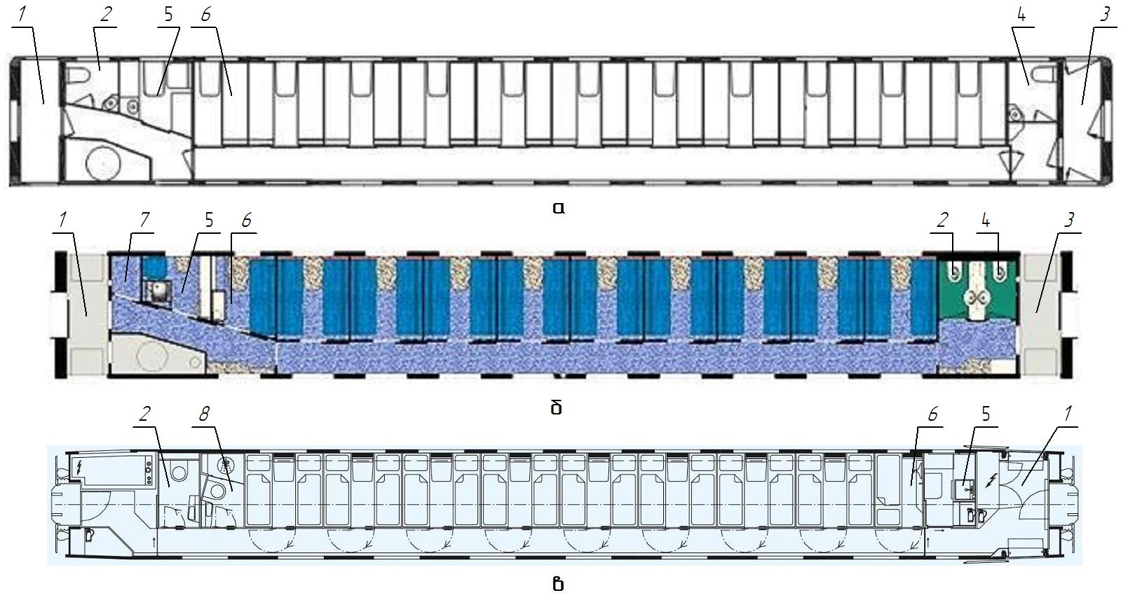 – із двома тамбурами й двома туалетними приміщеннями, розміщеними суміжно біля неробочого тамбура, тобто в одному кінці кузова вагона (рис. 1, б);