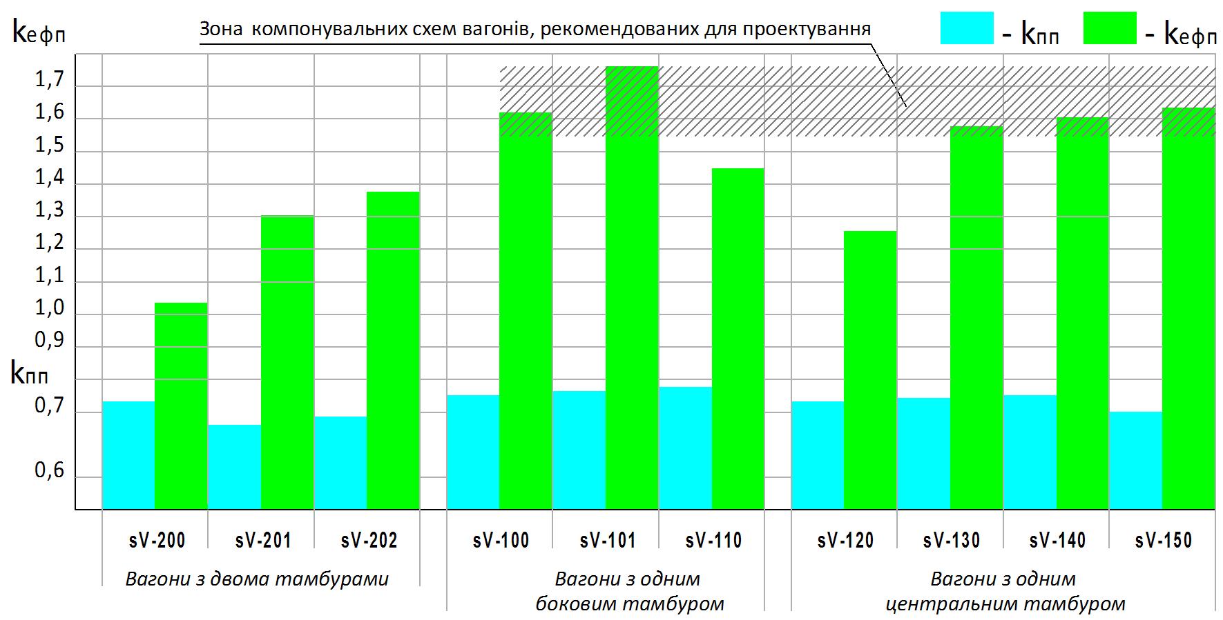 Мета. У роботі передбачено розроблення, аналіз і вибір компонувальних схем пасажирських вагонів за кількістю та розміщенням тамбурів і санітарних приміщень загального користування для створення перспективних конкурентоспроможних спальних купейних вагонів суттєво вищих рівнів комфортабельності й оцінку перспективності освоєння їх серійного виробництва з умови забезпечення максимальної вмістимості. Методика. Аналіз компонувальних схем та планувань наявних спальних купейних вагонів різних європейських виробників і компонувальних схем для створення перспективних вагонів цього типу за розмірними параметрами, кількістю й розміщенням тамбурів і санітарних приміщень загального користування проведено за визначеними критеріями й показниками ефективності запропонованих конструктивних рішень та комфортабельності вагонів. Результати. Розроблено компонувальні схеми для проєктування перспективних конкурентоспроможних спальних купейних вагонів, обладнаних двома або одним тамбуром і трьома-чотирма санітарними приміщеннями загального користування – туалетами, туалетами, суміщеними з душовими стояками або душовими кабінами, та окремими душовими кабінами. Запропоновано методику оцінки ефективності пропонованих конструктивних рішень та комфортабельності перспективних спальних купейних вагонів за кількістю, призначенням і розміщенням санітарних приміщень різного призначення та зручністю користування ними пасажирами. На основі проведеного аналізу запропонованих компонувальних схем вибрано їх оптимальні варіанти, рекомендовані для створення перспективних конкурентоспроможних спальних купейних вагонів суттєво вищого рівня комфортабельності. Наукова новизна. Уперше проведено аналіз наявних та нових компонувальних схем пасажирських спальних купейних вагонів за кількістю й розміщенням тамбурів і за кількістю, типами й розміщенням санітарних приміщень загального користування на основі розробленої методики об’єктивної оцінки ефективності запропонованих компонувальних рішень, рівнів комфортабельності вагонів та зручності користування ними пасажирами. Практична значимість. Проведений аналіз дає можливість обґрунтованого вибору вже на стадії розроблення ескізних пропозицій оптимальних компонувальних схем для створення перспективних конкурентоспроможних спальних купейних вагонів різних класів підвищеної комфортабельності порівняно з вагонами-аналогами.