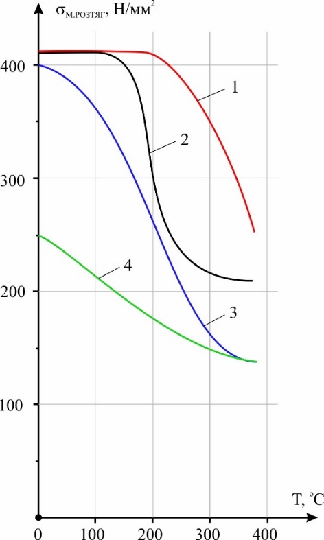 Рис. 1. Зміна механічних властивостей провідникових матеріалів залежно від температури й часу нагрівання – для твердотягненого мідного дроту за його швидкого охолодження (1) й повільного (2) нагрівання; 3 – для твердотягненого мідного стрижня діаметром 50 мм за повільного нагрівання; 4 – те ж для стрижня з м’якої міді