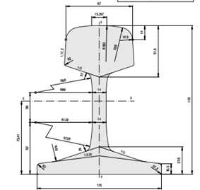 Such Vignol rails: 49E1, 54E1 (and MÁV48) with 1: ∞, 1:40, 1:20 rail inclination, grooved or Phoenix rails: 51R1, 59R2, 60R2 (more recently 67R1, most of them are already produced with 1:40 rail head geometry). Even non-standard block rails are used in precasted concrete panel tracks in Budapest are widespreadly used: B3 (formerly known as Ts52) and B1, both with 1:∞ rail inclination.