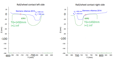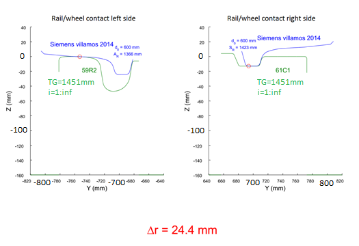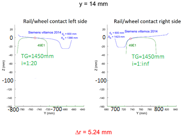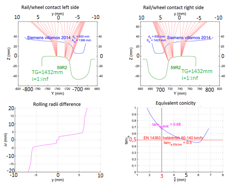 Briefly, the operation is inadequate in all respects (tanɣe, equivalent conicity, contact surfaces, RRD:Rolling Radius Difference), especially when running in narrow curves.