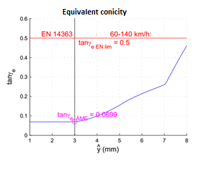 EN 15302 [3] provides a precise mathematical method for determining the equivalent conicity for non-linear tapered wheels. (The well-known Klingel formula refers to a «linearly» tapered wheel profile).