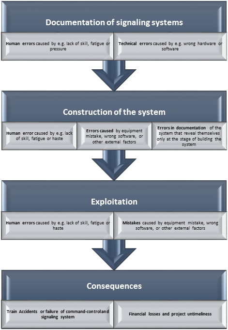 At each stage of creating a command-control and signaling system errors may occur, which then affect the proper operation of the system or its safety. The diagram (Fig. 5) shows an example of the cause of errors which, at a certain stage of development of the system, may cause a decrease the level of security.