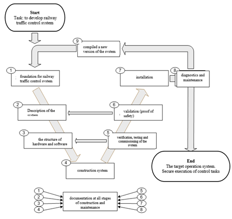 The process of designing, manufacturing, deployment and operation of computerized control-command and signalling systems due to the complexity and compliance with the safety requirements while maintaining the conditions of integrity of the structure of hardware and software SIL 4 requires application of specific rules and procedures. In the area of knowledge relating to this process, there are a number of different standards developed by individual centres, academic and industrial societies which develop their own standards and do not meet the mutual compatibility requirements. Regardless of any individually developed methods, the process of control-command and signalling system development may proceed methodically based on the recommended scheme called the V cycle, taking into account the assumptions of the RAMS analysis.