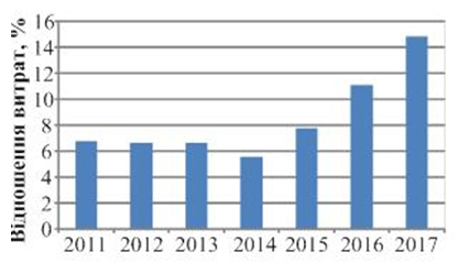 Дослідження виконувались на основі аналізу витрат КП «Київський метрополітен» протягом 2011−2014 років, а також шляхом розрахунку очікуваної зміни даного показника протягом 2015−2017 років, враховуючи поетапне підвищення вартості тарифів. Результати виконаних досліджень у вигляді діаграм наведено на рис. 3.