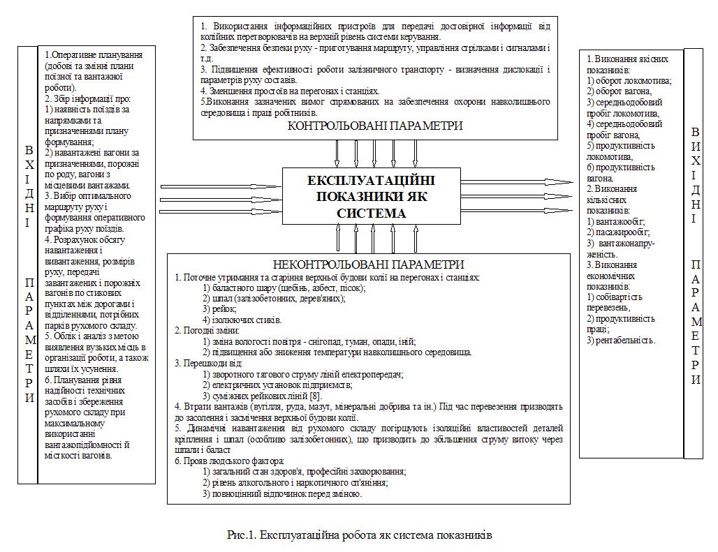 Під час планування роботи здійснюється підбір вхідних параметрів на основі інформації, що задається роботою залізничного транспорту, а вихідні – визначають обсяг та якість виконання роботи. Ступінь впливу контрольованих параметрів на систему може бути знижений як технічними, так і організаційними рішеннями. Для зниження ступеня впливу неконтрольованих параметрів на систему показників знадобляться істотні витрати на вдосконалення технічних засобів, які дозволять, хоча б непрямо контролювати параметри, які схильні до змін. Наприклад, такими технічними рішеннями є рейкові кола на залізничних станціях, перегонах, сортувальних комплексах, які, в зв’язку з різким погіршенням стану баластної призми, призводять до формування сигналів «помилкової зайнятості», що, в свою чергу, впливає на досягнення якісних, кількісних і економічних показників роботи залізничного транспорту.