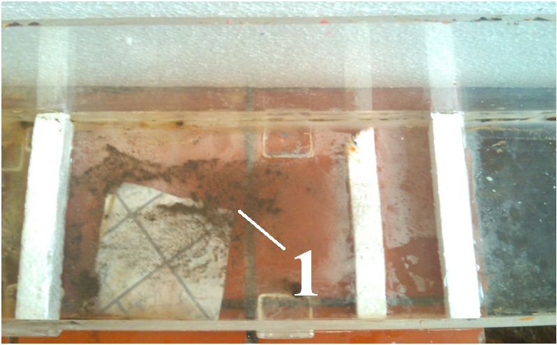 Fig. 3. Sludge (1) on the bottom of the classical horizontal settler (top view)