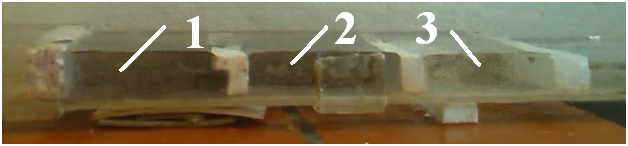 Fig. 2. Experimental model of horizontal settler with plates (Г-shaped, vertical and horizontal): 1 – distribution of the sludge inside the horizontal settler in the first zone (in front of the Г-shaped plate); 2 – distribution of the sludge inside the horizontal settler in the second zone (in front of the vertical plate); 3 – distribution of the sludge inside the horizontal settler in the third zone;