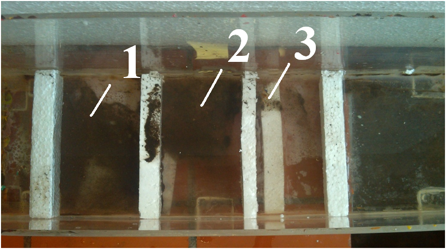 Fig. 4. Sludge on the bottom of the modified horizontal settler (top view): 1 – zone before Г – shaped plate; 2 – zone before vertical plate; 3 – zone after vertical plate