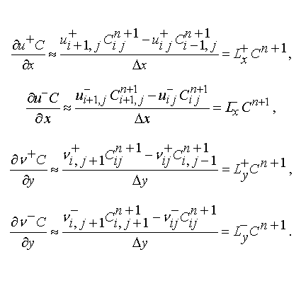 To solve the mass conservation equation (1) the implicit difference scheme of splitting is used [1, 7]. At first step the physical splitting of equation (1) is carried out: