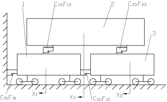 В начальный момент набегания сцепа на преграду платформа 1 получает жесткий удар, сила которого при любой скорости соударения V0 к началу деформации упругой связи С01 практически мгновенно возрастает до величины силы трения F01. В результате платформа 1 как жесткое тело приобретает ускорение x1, зависящее от степени участия в ударе каждой из масс системы. Возможны следующие варианты взаимодействия тел.