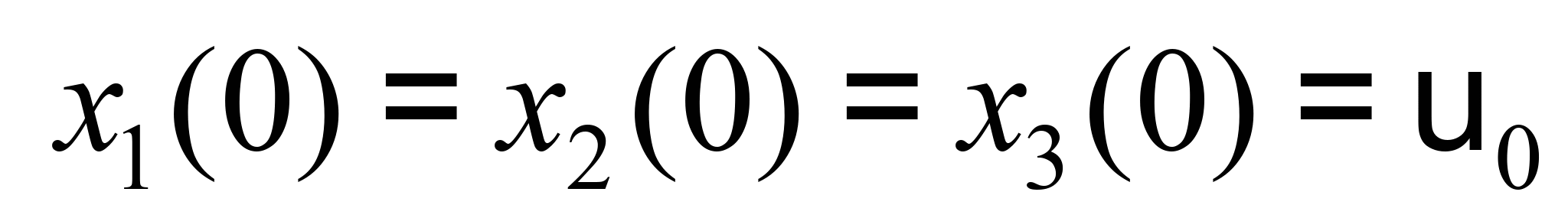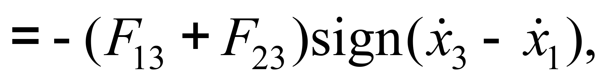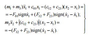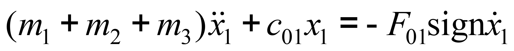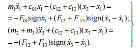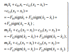 Все три массы системы жестко соединены между собой силами сухого трения в единое тело и на первом этапе движутся совместно (x1 = x2 = x3). Условия, при которых возникает такое движение, могут быть представлены в виде: