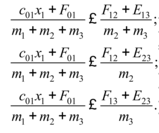 Все три массы системы имеют перемещения относительно друг друга. Такое движение возникает в случаях, когда не выполняется ни одно из условий (1), (4), (7), (10) в начале движения или нарушаются первые неравенства в условиях (6), (9), (12). Дифференциальные уравнения этого вида движения имеют вид (13). Рассматриваемый характер движения сохраняется до возникновения условий для жесткого соединения каких-либо масс силами трения.