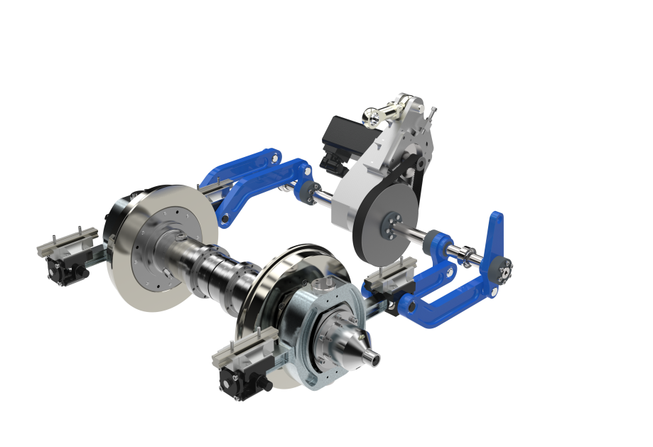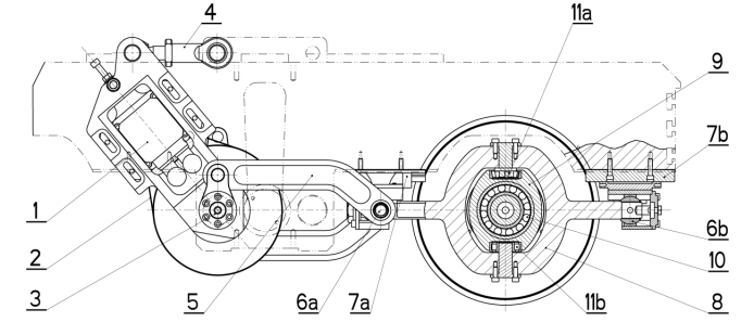 The bogie has no primary suspension and the wheelsets can move only in the yaw direction towards the bogie frame. Each wheelset is independently actuated by an active controlled mechanism (Fig. 5). The actuator is a permanent magnet synchronous servomotor M408S (item 1) with rated torque 2.5 Nm. It can be controlled to the desired magnitude of yaw torque acting on the wheelset, or to a desired value of yaw angle between the wheelset and the bogie frame. The actuator torque is transmitted via the toothed belt (item 2) to a steering rod (item 3) and finally by two pairs of linkages (item 5) to the wheelset.
