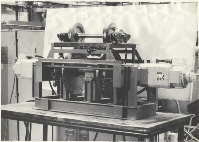 The scale of the first CTU roller rig was 1 to 3.5 and it remained unchanged until now. The rig was built as an initial step of full scale roller rig development. Because the project of the full scale roller rig has never been started, the first scaled roller rig became a basis for all future roller rig testing at the CTU. The rig has been improved and updated many times, where the design changes were specifically performed mainly according to the objectives of the projects in which the rig was used. The first major modification came during the first half of the 90’s, when the rig was completely rebuilt to a 2-axle type configuration (Fig 2). The experimental two-axle bogie had a wheelbase of 714 mm, track gauge of 410 mm and wheels diameter 263 mm. This corresponds to a wheelbase of 2500 mm and 920 mm wheel diameter for real standard gauged vehicle [11, 12]. In the following period the rig was not intensively used.