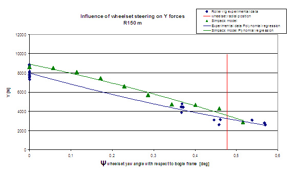 In accordance with the CTU scaling strategy, the parameters of a virtual bogie were calculated. This virtual bogie is a full scale representation of roller rig test bogie. The MBS software Simpack was used to build a computer simulation model of the virtual full scale bogie and perform simulations of curve negotiation. The radius of the curve vas 150 m and the vehicle speed was set up to 35 km/h. To obtain similar conditions as we are able to simulate on the roller rig, the lateral acceleration was fully compensated by rail superelevation and the friction coefficient set up to 0.3. Different respective wheelset steering angles were set up and the mean value of Y-force on the outer wheel of the leading axle was observed.