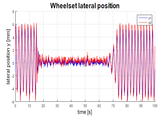 Fig. 8 shows measured lateral positions of both wheelsets during a roller rig test. It can be seen, that once active yaw damping control is switched on (from 15 to 66 s) both wheelsets run in the centre of a track, whereas without active control wheelsets exhibit heavy hunting.