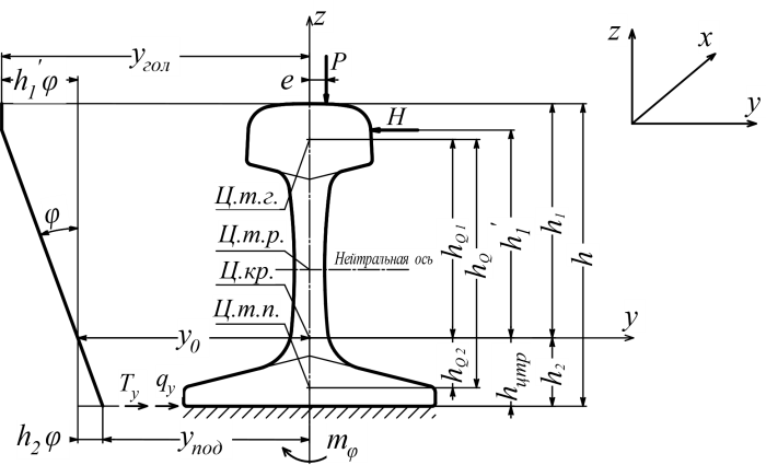Действующая методика инженерных расчетов пути на прочность [3], как известно, позволяет получать только результаты с точностью, достаточной лишь для практических целей. При этом влияние на работу рельса горизонтальных динамических сил и крутящего момента непосредственно не учитывается, а учитывается только опосредованно через применение так называемых коэффициентов влияния, взятых из экспериментальных исследований, и во многих случаях не имеют точного подтверждения для конкретных расчетов.