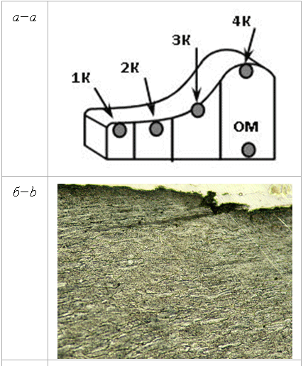На першому етапі роботи методами оптичної, растрової і електронної мікроскопії, а також розрахунково-аналітичним методом визначено ділянку профілю кочення залізничного колеса, яка зазнає найбільших змін структури металу під дією тривалих експлуатаційних навантажень. Встановлено, що це є зона переходу від поверхні кочення до гребеня колеса (3К, рис.1, а).
