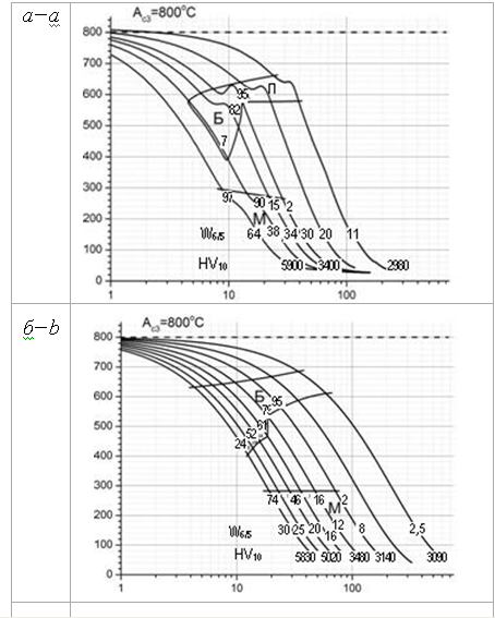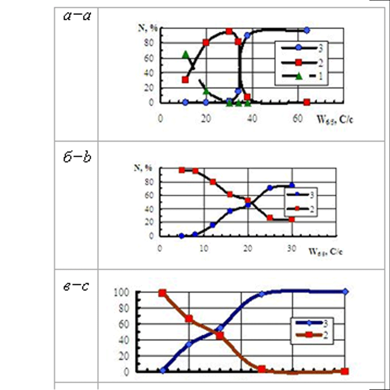При імітації термодеформаційного циклу наплавлення (комплекс «Gleeble 3800») модельні зразки нагрівали до температури 1 250 °С зі швидкістю 25 °С/с (характерно для умов звичайної термічної обробки) та 210°С/с (умови дугового наплавлення). Час перебування металу при температурах вище Ас3, залежно від умов нагріву і швидкості охолодження, становив t1 = 23−66 с та t1 = 7–10 с відповідно. Швидкість охолодження зразків W6/5 (в діапазоні температур 600−500 °С) змінювалася в межах 2,5−64 °С/с. Використовували також можливість дослідного устаткування охолоджувати зразки при постійному зниженні температури, імітуючи реальні умови при дуговому наплавленні. За результатами досліджень побудовані термокінетичні діаграми перетворення переохолодженого аустеніту в металі ЗТВ сталі КС2 (рис. 2).