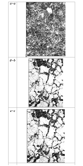 Встановлено, що незавершеність процесів гомогенізації аустеніту, внаслідок швидкого нагріву і обмеженого часу перебування металу при температурах вище точки Ас3 при дуговому наплавленні, суттєво впливає на перетворення переохолодженого аустеніту в ЗТВ. При швидкості охолодження 2,5−30 °С/с, яка характерна дуговому наплавленню, в металі ЗТВ формуються виключно гартівні структури. При цьому мінімальна швидкість охолодження W6/5, при якій починається формування мартенситної складової в структурі металу при С = 0,58 %, знижується від 30 °С/с до 8 °С/с, а критична швидкість охолодження W50М, при якій в структурі металу ЗТВ утворюється 50 % мартенситу, становить 20 °С/с. Структура металу ЗТВ залежно від швидкості охолодження наведена на рис. 3, де мартенситна складова подана у вигляді світлих ділянок.