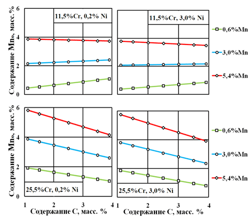 1. В Fe – C – Cr – Ni – Mn сплавах максимальное содержание марганца в основе имело место при минимальном содержании углерода и никеля и максимальном содержании хрома и марганца.