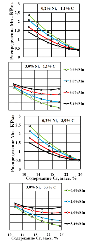 Коэффициент распределения марганца (КРMn) определяли как отношение содержания марганца в карбидах (Mnк) к его содержанию в основе (Mnо).